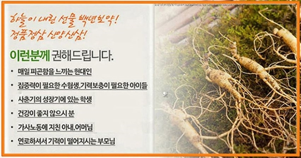 산양산삼은 청정지역 자연속에서만 자라나기 때문에 더 귀하다고 하는데요, 여러가지 건강식품 중에서도 몸이 느끼는 반응속도가 빠르다 보니 재구매를 하시는 분도 많다고 하네요.